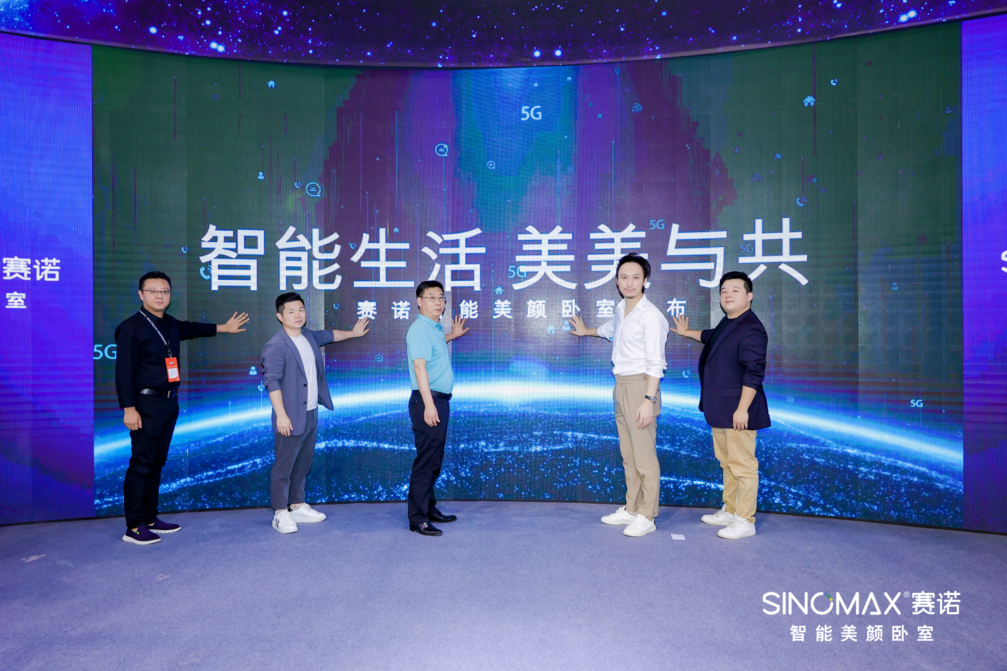 活动最后,广东省家居业联合执行会长蒋德辉先生、赛诺家居总经理林仕超先生、副总经理覃文先生、今日家居出版人阎栋先生、厦门联合呼吸健康研究院医工中心副主任黄亦鹏先生上场,共同启动赛诺智能美颜卧室的正式发布!