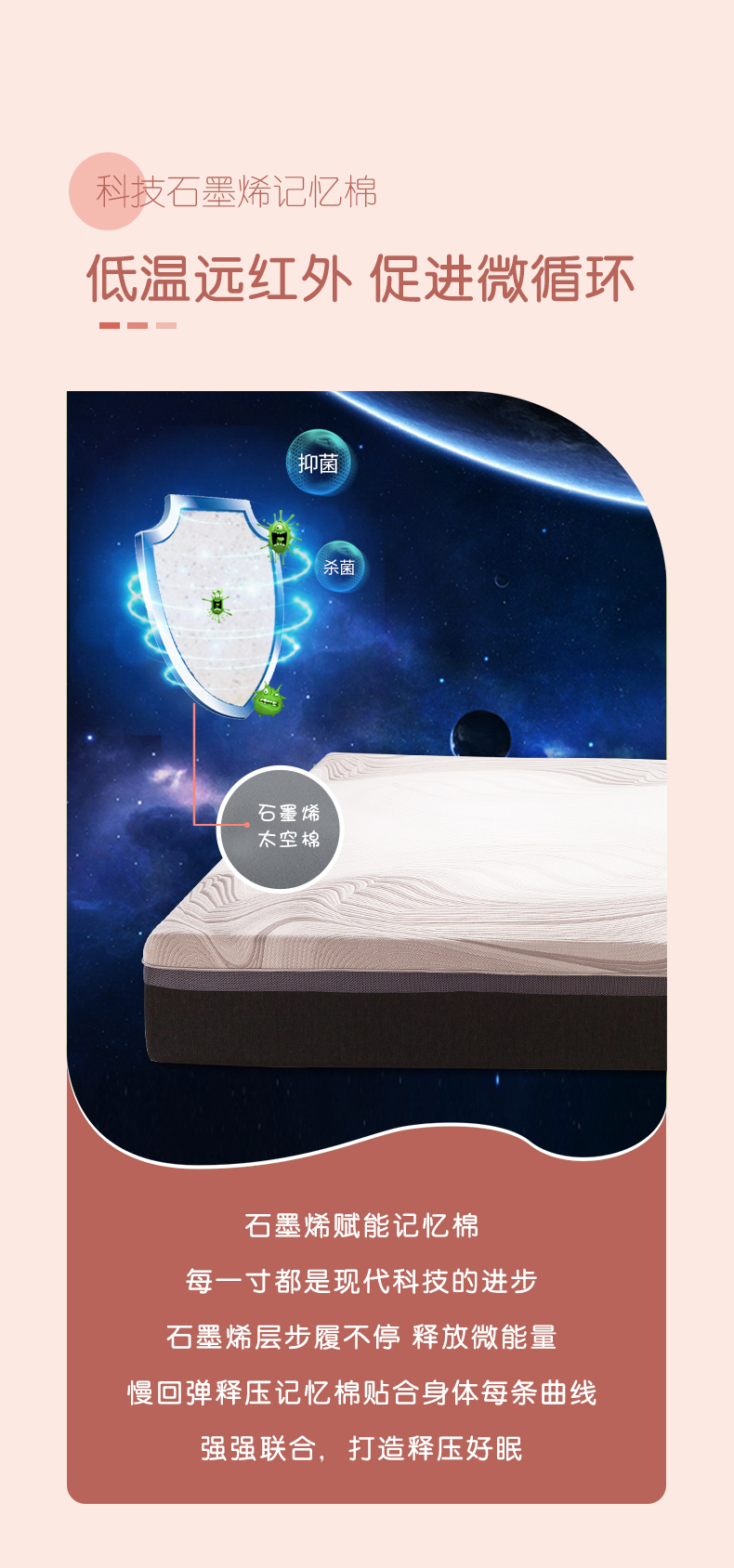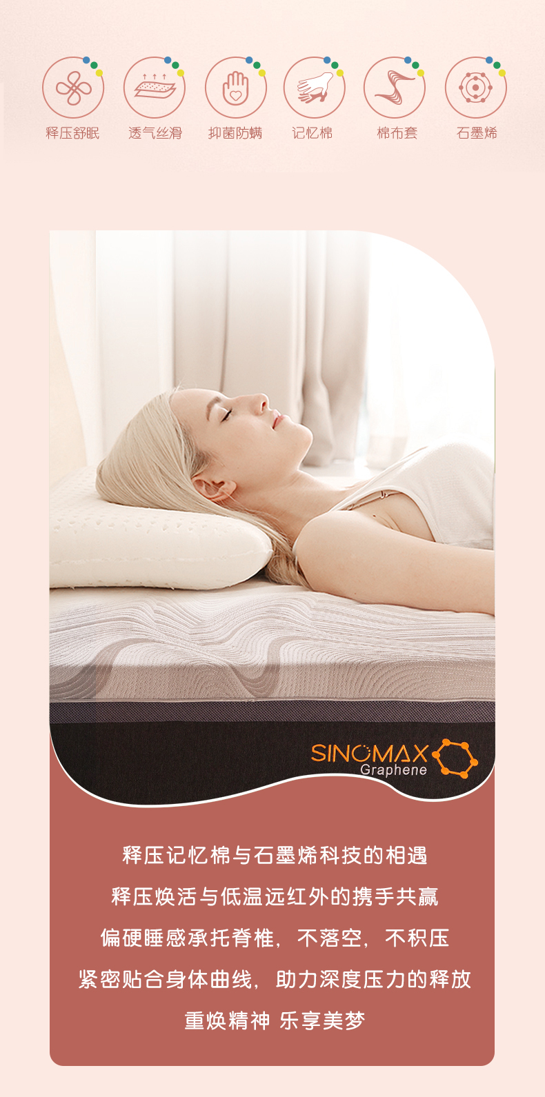 释压记忆棉与石墨烯科技的相遇释压焕活与低温远红外的携手共赢偏硬睡感承托脊椎,不落空,不积压紧密贴合身体曲线,助力深度压力的释放重焕精神 乐享美梦