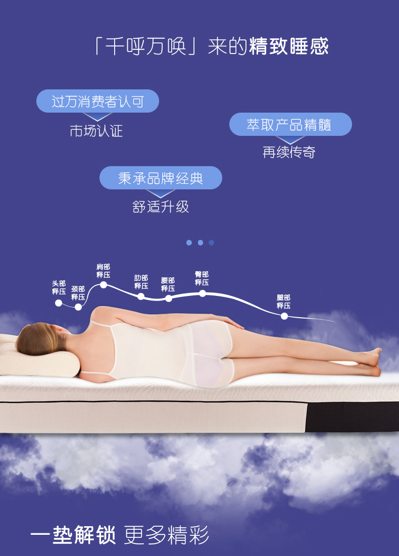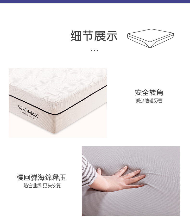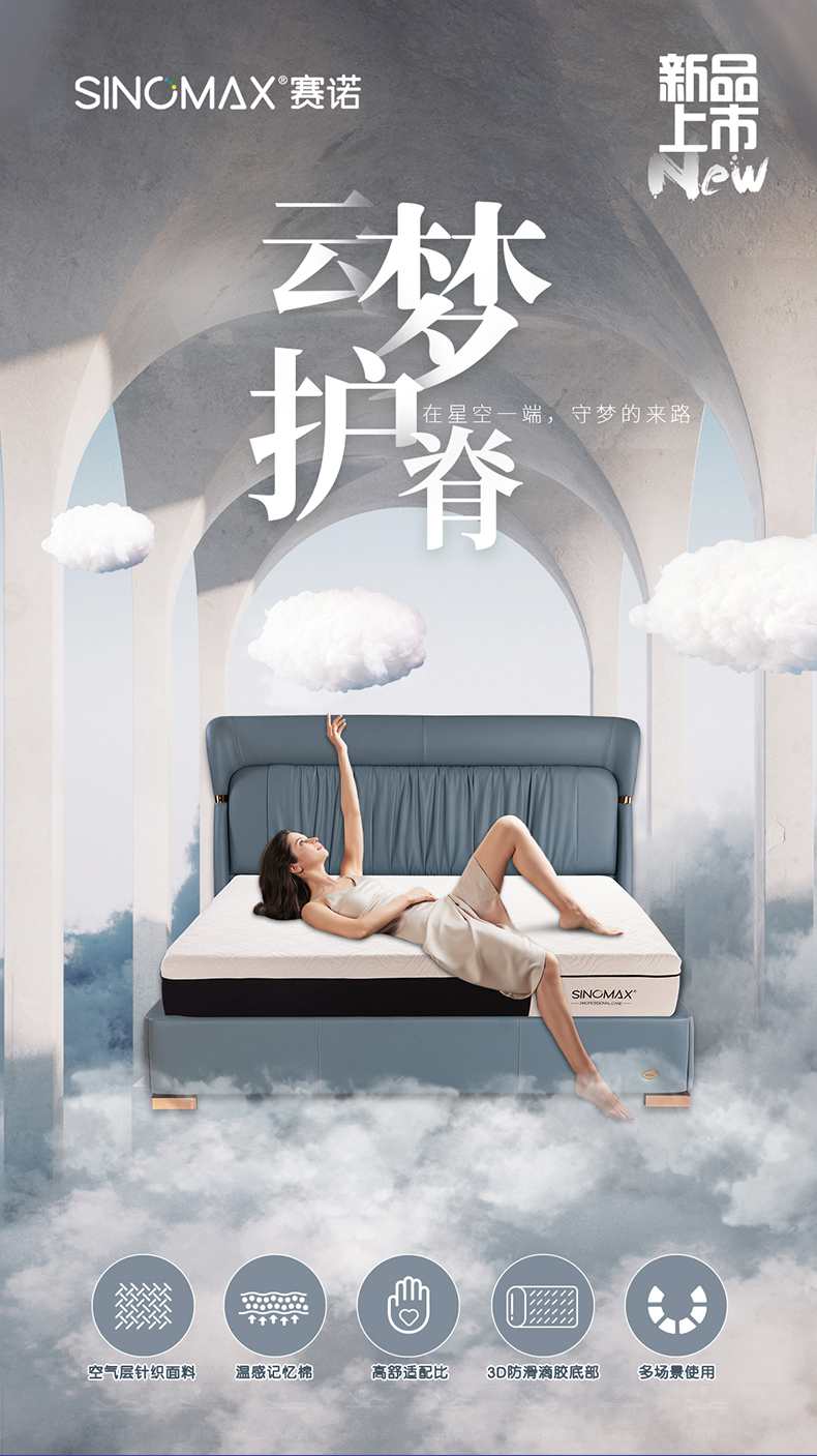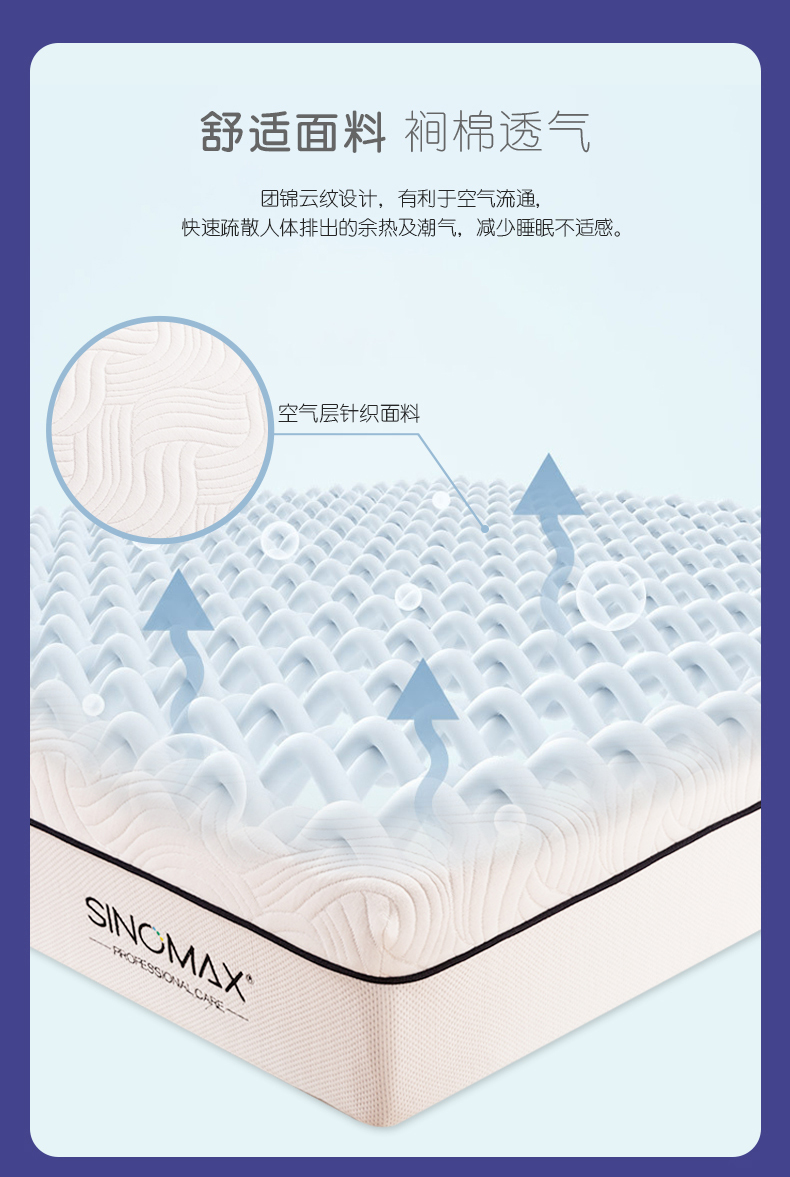 舒适亲肤面料透气清爽+赛诺记忆棉完美贴合身体曲线,保护脊椎,呵护整晚睡眠。