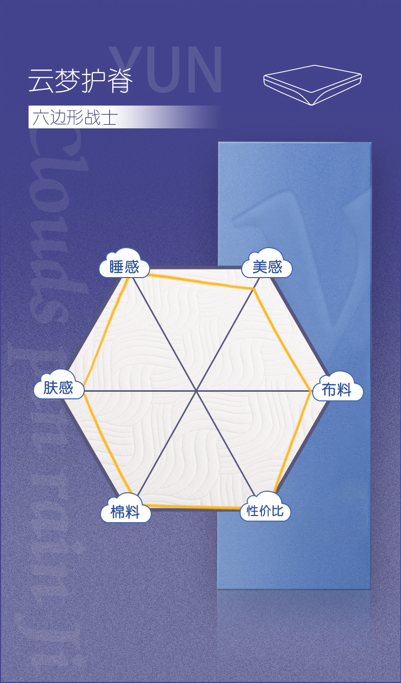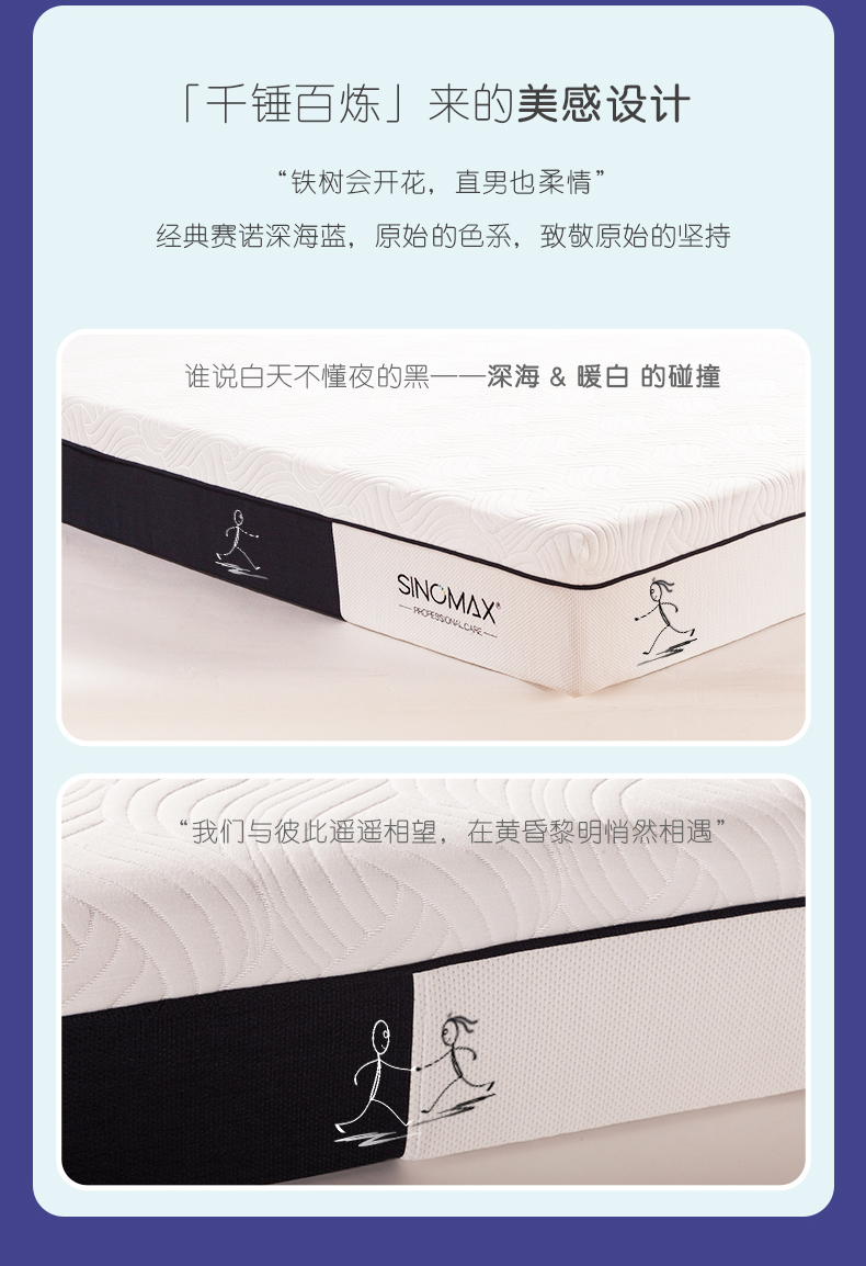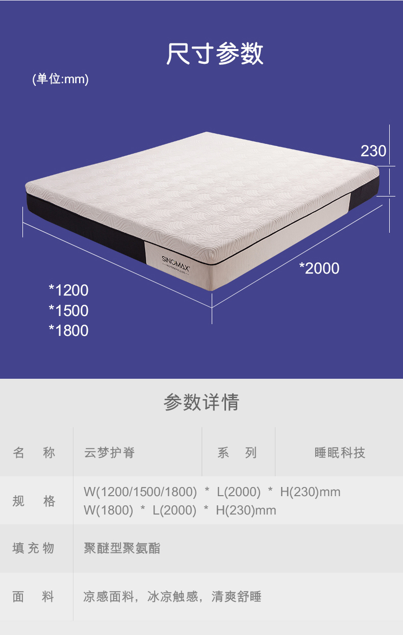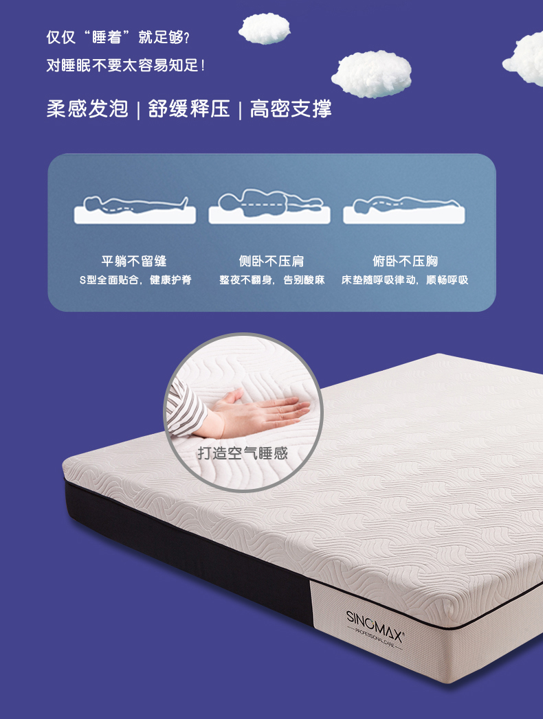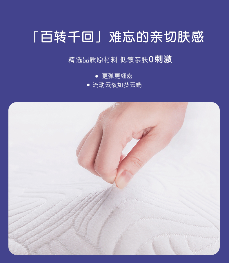 舒适亲肤面料透气清爽+赛诺记忆棉完美贴合身体曲线,保护脊椎,呵护整晚睡眠。
